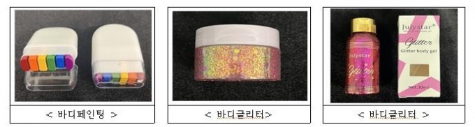 알리에서 판매하는 바디글리터 9개 제품에서는 메탄올 성분이 국내기준치(0.2%)의 43.2배를 초과한 8.635%, 안티몬 성분이 국내기준치(10㎍/g)의 최대 5배가 넘는 50.6㎍/g이 검출되었다.