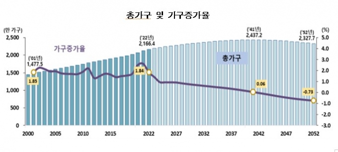 2022년 기준 우리나라 총가구수는 2166만이다. '1인 가구'의 비중은 2032년 39.2%로 늘고 2037년에 이르면 40.1%에 이를 것으로 예측됐다. 이처럼 '1인 가구'가 매년 증가하면서 2041년에 이르면 우리나라 총가구수는 2437만으로 늘어난다. 하지만 2042년부터는 마이너스로 돌아선다. 인구감소에 따른 영향으로 정점을 찍고 내려오면서 2052년에 이르면 총가구수는 2327만7000가구로 쪼그라든다.