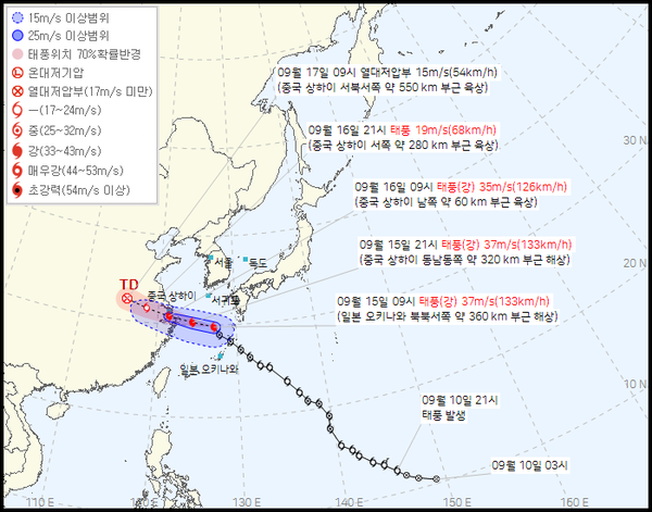 태풍은 현재 시속 23㎞ 속도로 북북서 방향으로 이동하고 있으며, 이날 오후 9시경 중국 상하이 동남동쪽 약 320㎞ 해상에 도달할 것으로 보인다. 이때까지도 태풍 강도는 강한 상태를 유지할 전망이다.