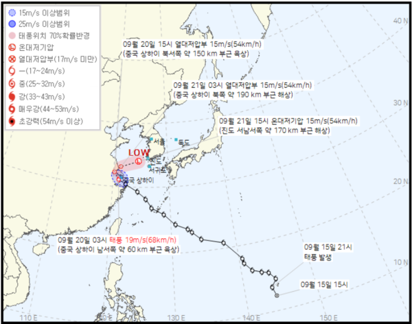 19일 기상청은 '풀라산'이 21일 오후 3시쯤 진도 서남서쪽 약 170㎞ 부근 해상에 접근할 것으로 예측하고 있다. '풀라산'이 한반도로 이동하는 과정에서 온대저기압으로 바뀌어 태풍으로서 힘을 잃었다고 하지만 남쪽의 습한 공기를 한껏 머금고 오기 때문에 장마전선과 만나 물폭탄을 쏟아낼 가능성이 높다.