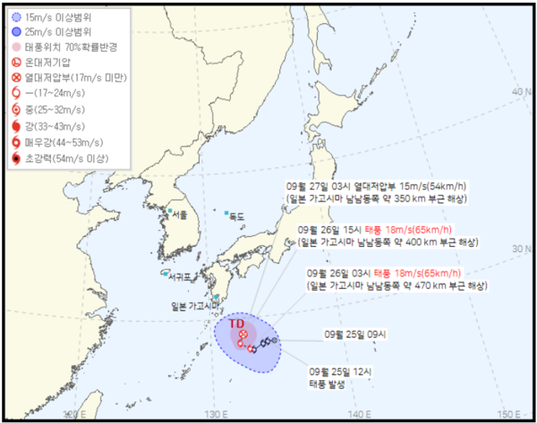 '시마론'의 중심기압은 1002헥토파스칼(hPa), 최대풍속은 초속 18m이며 강풍반경은 230㎞다. '시마론'은 26일 오전 3시쯤 일본 가고시마 남동쪽 약 460㎞ 부근 해상에 근접했고, 오후 3시쯤 일본 가고시마 남동쪽 약 400㎞ 부근 해상까지 이동할 것으로 예측됐다.