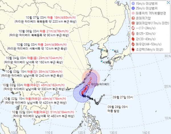 2일 기상청에 따르면 끄라톤은 이날 오전 3시 타이완 타이베이 남남서쪽 약 460㎞ 부근 해상에서 북동진 중이다. 최대 풍속은 시속 184㎞에 달하는 '매우 강' 상태이지만, 3일 오후 타이완 상륙 후 관통하는 과정에서 산지 지형 등의 영향으로 세력이 약해질 것으로 보인다.
