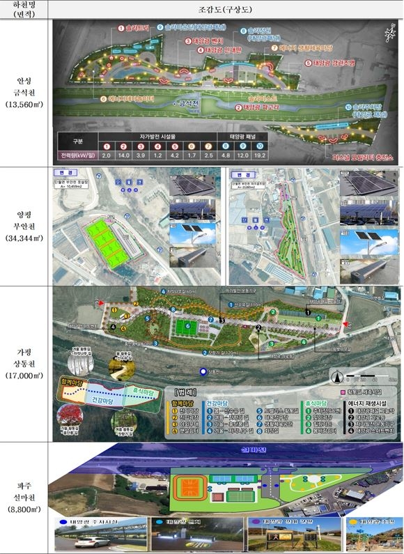 경기도는 하천변 주변 폐천부지에 '도민체감형 RE100 공원'을 조성할 장소로 안성시(금석천), 양평군(부안천), 가평군(상동천), 파주시(설마천) 등 4곳을 선정했다고 7일 밝혔다.
