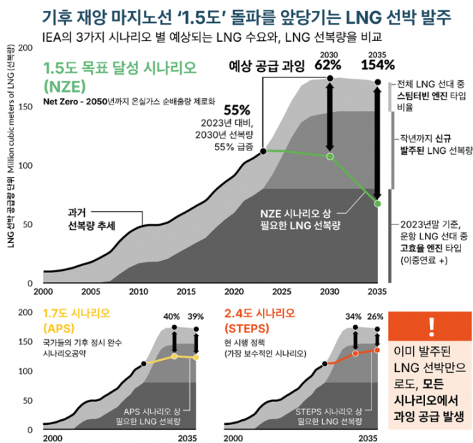 보고서는 지구 평균기온 상승폭을 1.5℃, 1.7℃, 2.4℃ 제한하는 시나리오에 따라 2030년, 2035년 LNG 수요와 LNG 수송용량의 공급과잉 정도를 분석했다. 가장 엄격한 1.5℃ 시나리오에 따르면 2030년 LNG 수송용량은 LNG 수요를 62% 초과하고, 2035년에 이르면 154%를 초과한다. 이는 약 630척의 과잉공급 상태로, 생산성이 급락하면서 금융 투자자, 조선소, 선주사 모두 리스크에 맞닥뜨릴 수밖에 없다는 분석이다.