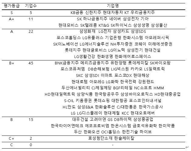 S등급을 받은 KB금융지주의 종합점수는 82.1점이고, 신한금융은 81.4점, 현대자동차는 80.6점, KT는 80.4점, 우리금융은 80.1점이다. KB금융이 지난해 3위에서 올해 1위로 올라섰다. 신한금융도 전체 2위를 기록하는 등 금융지주사들이 이번 평가에서 좋은 점수를 나타냈다.