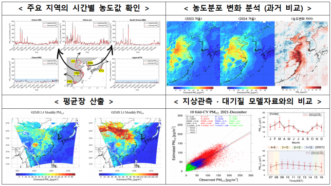 기존 영상은 단순히 미세먼지의 공간분포만 확인할 수 있었지만 이제는 지도에 나타난 격자별 농도값까지 확인할 수 있게 됐다. 이를 통해 주요 지역의 시간별 농도부터 지상관측이나 대기질 모델 자료와도 비교할 수 있다. 또 자료 활용시 추정농도의 정확도를 판단할 수 있도록 산출기법에 대한 오차정보도 제공된다.