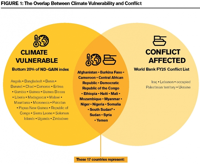 기후·분쟁 취약국 중 아프리카 국가는 소말리아·부르키나파소·카메룬·중앙아프리카공화국·콩고민주공화국·에티오피아·말리·모잠비크·니제르·나이지리아·남수단·수단 등이다. 아프리카 외 나라로는 아프가니스탄, 시리아, 아이티, 미얀마, 예멘 등이 있다.