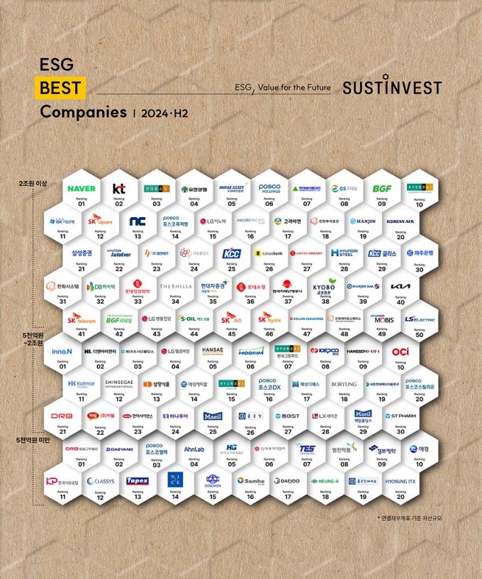 20일 ESG평가기관 서스틴베스트는 상장사 1069개사와 비상장사 264개를 포함한 1315개 기업을 대상으로 실시한 2024년 하반기 연간평가에서 자산규모 2조원 이상 상장기업 50곳, 5000억~2조원 상장기업 30곳, 5000억원 미만 상장기업 20곳 등 100개사를 ESG경영을 리드하는 'ESG Best Companies'로 선정했다.