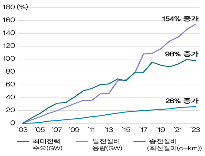 지난해 우리나라 최대 전력수요는 2003년 47기가와트(GW)에서 94GW로 98% 늘었고, 이에 맞춰 발전설비 용량도 56GW에서 143GW로 154% 증가했다. 반면 같은기간 송전망 회선길이는 2만8260서킷킬로미터(c-km)에서 3만5596c-km로 26% 증가했다. 이에 따라 생산된 전력이 수요지에 공급되지 못하고 있어, 정전을 비롯한 전력계통 안정성 문제가 발생할 가능성이 높아지고 있다.