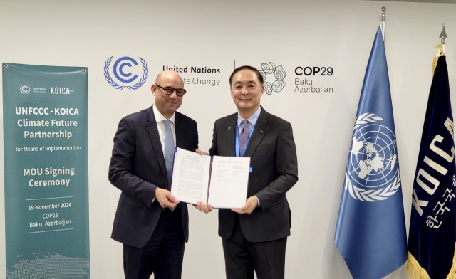 코이카는 19일(현지시간) 오후 제29차 유엔기후변화협약 당사국총회(COP29)가 열리는 아제르바이잔 바쿠에서 유엔기후변화협약 사무국과 '기후 미래 파트너십을 위한 업무협약(MOU)'을 체결했다고 20일 밝혔다. 양 기관은 오는 2027년까지 AI 기술을 기후변화 대응에 적용하는 사업과 분쟁·취약국의 기후재원 400만달러 확보를 돕는 사업을 함께 전개한다.