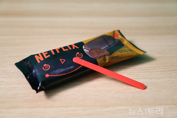편의점 GS25는 지난 6월 20일 넷플릭스와 손잡고 '넷플릭스 다크 초코바'를 출시했다. 이 제품은 나무 막대를 사용하는 여타의 아이스크림 바 제품들과 달리, 빨간색 폴리프로필렌(PP) 플라스틱을 사용했다.