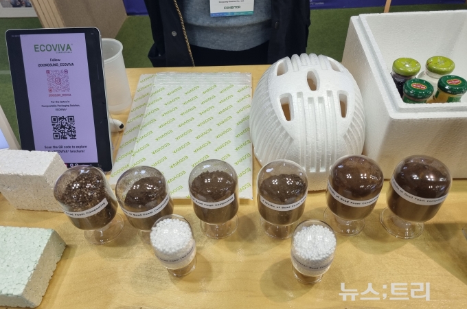 소재에 대한 신기술도 소개됐다. 동성케미컬은 발포스티렌 재질을 식물유래 생분해성 플라스틱인 PLA 소재로 구현한 포장 솔루션 '에코비바'를 선보였다. 99% PLA 재질로 6개월 안에 90% 이상 퇴비화되고, 환경독성도 없다. 탄소배출량 역시 종이 포장재의 20~30% 수준으로, 원하는 모양을 만들어내기 용이한데다 충격 완화 기능도 뛰어나다.