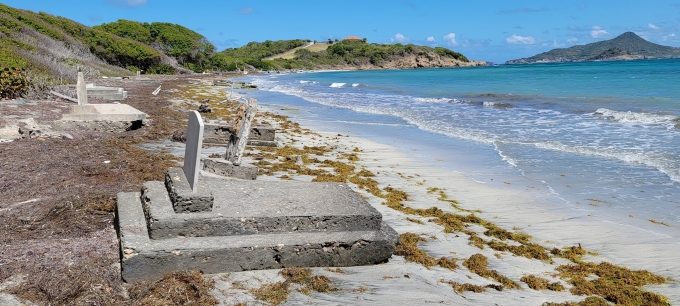 북대서양 카리브해에 있는 한 섬나라에 있는 바닷가 묘지들이 해수면 상승으로 바닷물에 휩쓸리고 있다.