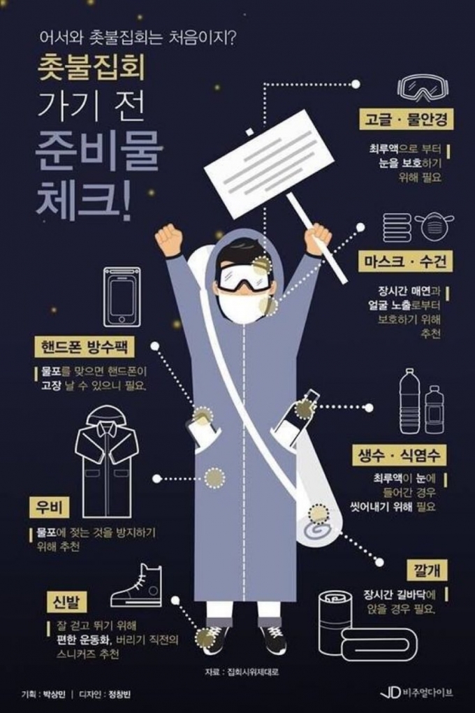 SNS에는 집회 준비물, 주의사항 등을 상세히 안내한 글도 쉽게 찾아볼 수 있다. 목도리·장갑·핫팩, 생수, 방석·깔개, 전자 촛불을 위한 건전지를 비롯해 혹시 모를 시위 진압에 대비해 휴대폰 방수팩, 고글·물안경, 마스크·수건 등을 준비하라는 안내도 있다. 겨울이니만큼 방한용품, 핫팩 부착 팁도 함께 공유되고 있다.