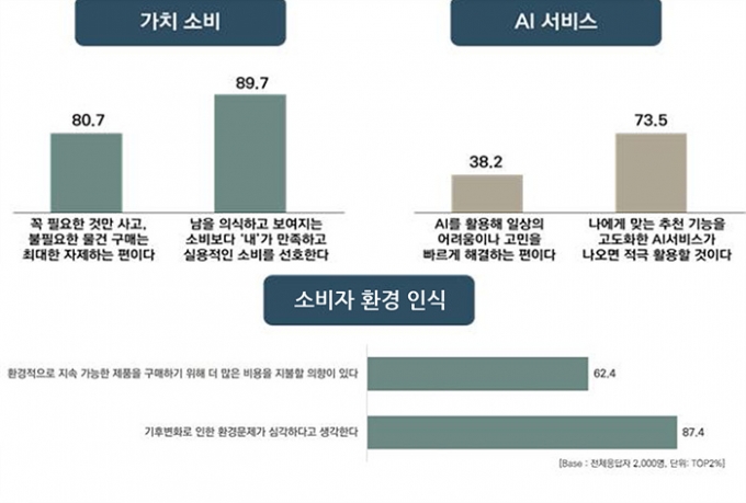 한편 인공지능(AI) 서비스 사용관련 질문에 'AI를 활용해 일상의 어려움이나 고민을 빠르게 해결하는 편'이라고 응답한 소비자는 38.2%로 절반 이하였다. 다만 향후 '나에게 맞는 추천 기능을 고도화한 AI서비스가 나오면 적극 활용할 것'이라고 응답한 소비자는 73.5%였다.