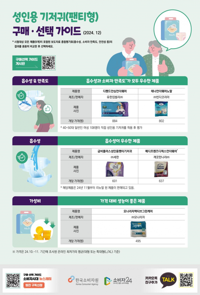 이번에 품질평가한 9개 브랜드는 △세한의 금비플러스성인용팬티기저귀(중국) △유니온메디컬의 내안에사랑성인용기저귀(중국) △유한킴벌리의 디펜드안심언더웨어(한국) △LG유니참의 라이프리안심언더웨어(태국) △깨끗한나라의 메디프렌즈디럭스언더웨어(중국) △모나리자액티브그린케어(중국) △에이원컴퍼니의 백세시대입는기저귀(중국) △이앤더블유의 애니릴리프시니어재활안심팬티(한국) △빈다코리아의 테나언더웨어노말(중국)이다.