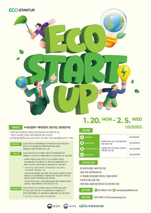 환경부는 '에코스타트업 지원사업'에 내년도 새롭게 시작하는 특허청의 '공공 특허기술 활용 기후테크 성장지원 사업'을 접목해 내년 1월 20일~2월 5일까지 '2025년도 에코스타트업 지원사업'에 참여할 녹색산업분야 예비 창업자 및 창업기업을 특허청과 공동모집한다고 30일 밝혔다.