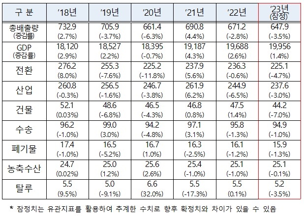 2022년도 국가온실가스 배출량은 에너지·산업공정·농업·폐기물 등 전 분야에 걸쳐 전년보다 감소한 것으로 나왔다. 에너지 부문이 2.6%로 가장 많이 감소했고, 산업공정·제품사용 부문은 1.1% 줄었다. 또 농업 부문 배출량은 0.5%, 폐기물은 0.8% 감소했다.