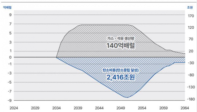 정부가 제시한 140억 배럴의 석유가스 자원이 성공적으로 채굴돼도 문제다. 채굴로 인한 탄소비용이 적게는 213조원에서 최대 2416조원에 이를 것으로 추산되기 때문이다.
