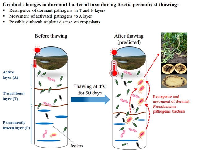 특히 동토층에 묻혀있던 세균 슈도모나스(Pseudomonas) 속의 균주들은 감자 무름병을 일으키는 것으로 드러났다. 이들은 중위도 지역에서 과일, 채소 등을 감염시키는 병원균으로 알려졌으며, 이번 실험으로 북극 툰드라의 전이층과 영구동결층에서도 존재가 확인됐다.