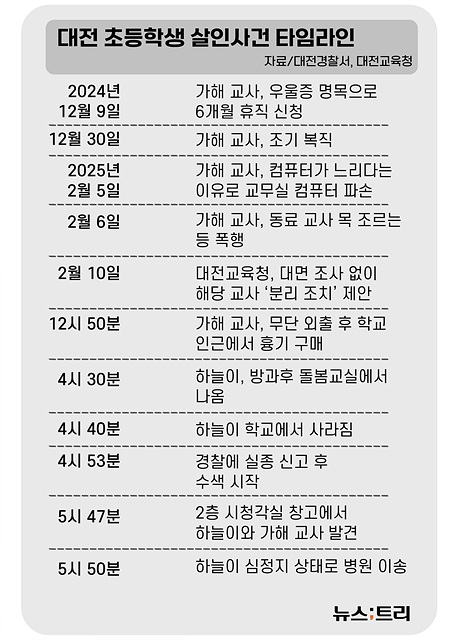 불안정한 모습을 보였음에도 학교측은 명씨를 예의주시하지 않았다. 사건 당일 명씨는 오후 12시50분쯤 학교 인근 마트에서 흉기를 구입하고 오후 1시50분쯤 학교로 돌아왔다. 이후 교장과 교감 등과 휴직에 대한 상담을 진행했다. 상담이 진행된 이후 명씨는 하늘이를 상대로 끔찍한 범행을 저질렀던 것이다.