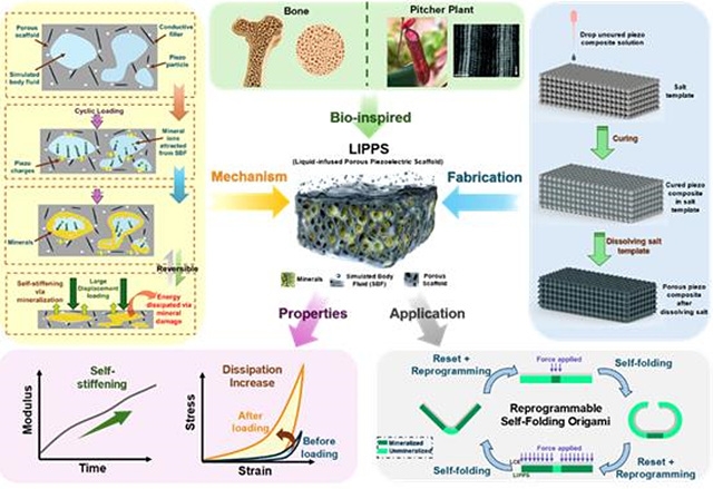 통상 아파트 건물이나 차량 등은 반복적으로 하중을 받으면 성능이 저하되면서 일정시간이 지나면 고장나거나 파손돼 버린다. 이에 연구팀은 이 문제를 해결하기 위해 뼈가 운동에 의해 강해지는 생체원리를 응용해 힘을 많이 가할수록 더 많은 전하가 생성되는 다공성 압전 바탕재를 만든 후 그 안에 피와 유사한 미네랄 성분을 갖는 전해질을 넣어 복합재료를 합성했다.