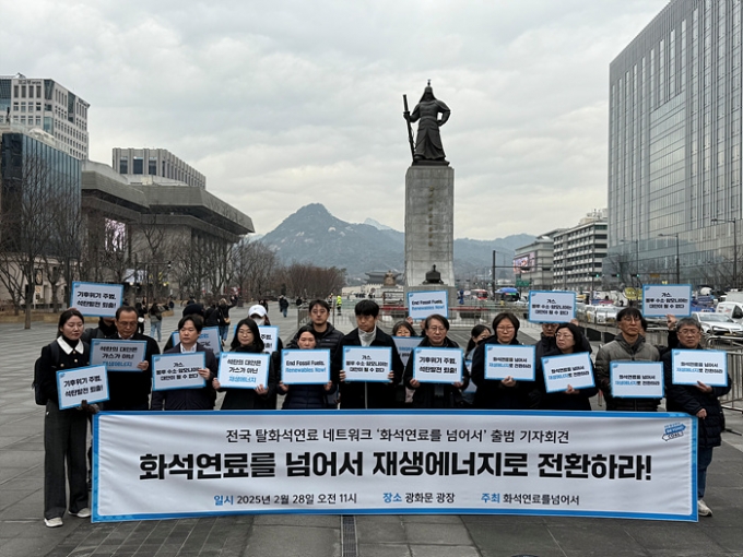 기후솔루션·플랜1.5·환경운동연합 등은 28일 오전 11시 서울 광화문 광장에서 가진 기자회견에서 '화석연료를 넘어서' 출범을 공식 선언했다. 이들 단체는 재생에너지로의 완전한 전환을 위해선 석탄뿐 아니라 가스 등 모든 화석연료에 대한 대응이 필요하다고 입을 모았다.