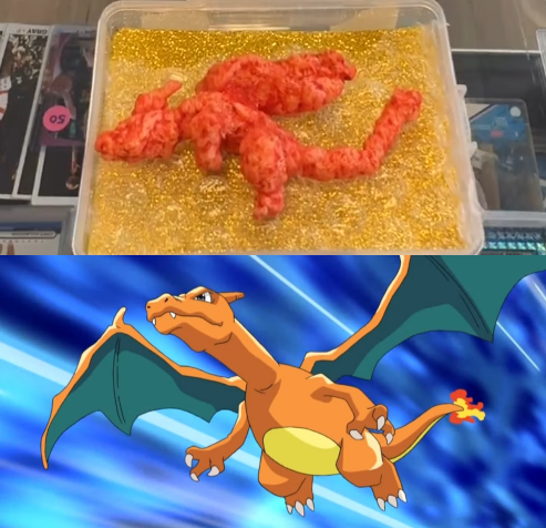 8㎝ 길이의 이 과자조각은 포켓몬 '리자몽'이 비행하는 옆모습과 유사한 데다 '플레밍 핫'이라는 매운맛 치토스라는 점이 불속성 포켓몬인 '리자몽'과 딱 들어맞는다.