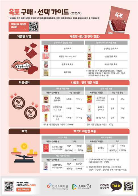 이에 비해 부드러운 한우육포(초록마을), 코주부육포 ORIGINAL(코주부 B&F)는 영양성분(나트륨·지방) 표시치와 실제 함량에 차이가 있어 품질관리 및 표시개선이 필요했다.