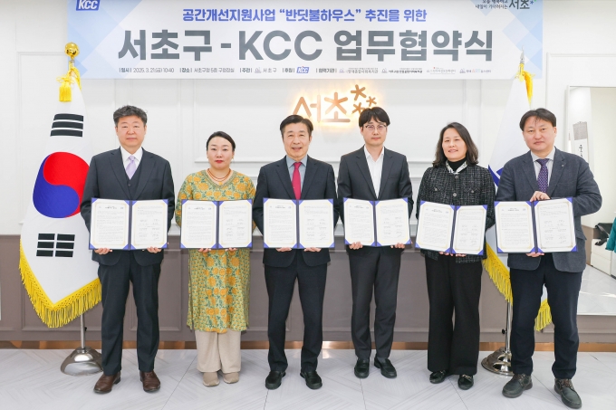 KCC와 서초구는 올해도 사회취약계층 주거환경 개선을 위해 추진하는 '반딧불 사업'을 위한 업무협약을 서초구청에서 지난 21일 체결했다고 24일 밝혔다. 이 자리에는 KCC 백승근 수석, 서초구 전성수 구청장을 비롯해 4개 복지기관 관계자들이 참석했다.