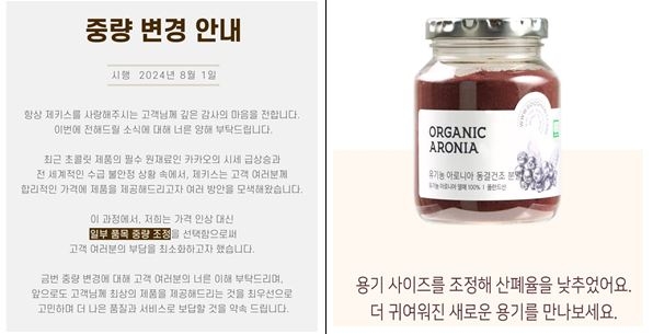 용량변동 사실을 소비자에게 고지하지 않은 상품은 6개였고, 용량 변경 전후 사항을 안내하지 않는 등의 고지가 미흡했던 상품은 3개였다.