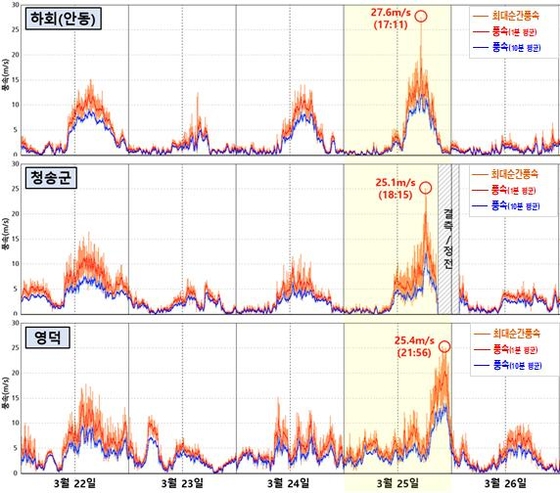 바람도 이례적으로 강했다. 경북 영덕 등 7개 지점에서 3월 하순 일 최대 순간풍속은 초속 25m로 1위를 기록했다. 의성에서는 22일 일 최대 순간풍속 초속 17.9m로 역대 3번째로 강했다. 이처럼 고온 건조한 날씨에 이례적인 강풍까지 더해지면서 불길이 빠르게 번진 것이다.