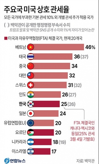 도널드 트럼프 미국 대통령은 2일(현지시간) 백악관에서 모든 수입품에 대해 국가별로 10~49% 관세를 부과한다고 발표하면서, 한국산에 대해서 25% 관세를 매겼다. 미국은 전세계 국가에 공통적으로 10% 관세를 일괄적으로 부과하는 것 외에 60여개 국가에 대해서는 추가로 최대 39%의 관세를 매겼다. 이에 따라 추가관세 대상국가들은 작게는 11%에서 많게는 49%까지 관세를 내야 한다. 우리나라는 10% 일괄관세에 추가로 15% 관세가 부과되면서 25% 관세가 적용됐다.