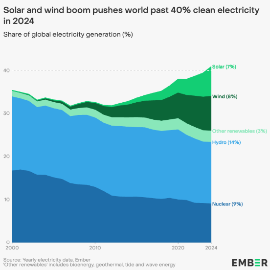 7일(현지시간) 글로벌 에너지 싱크탱크 엠버(Ember)가 발표한 '2025 글로벌 전력 리뷰(Global Electricity Review 2025)'에 따르면, 2024년 전세계 전력 생산에서 청정에너지 비중은 40.9%로 집계됐다. 이는 1940년대 이후 처음으로 기록된 수치다.