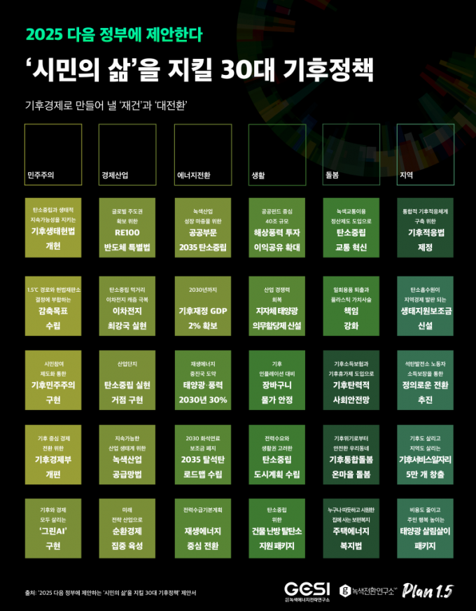 녹색에너지전략연구소·녹색전환연구소·플랜1.5 등 국내 민간 기후싱크탱크 3곳은 10일 공동발간한 '2025 다음 정부에 제안하는 시민의 삶을 지킬 30대 기후정책(이하 제안서)'을 통해 "기후대응이 다음 정부의 모든 정책에 기반이 돼야 한다"고 강조하면서 이같이 제언했다.