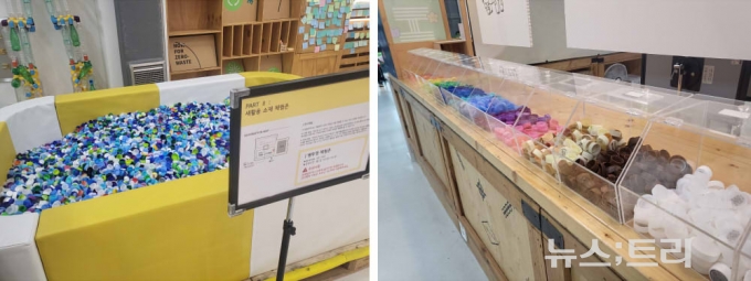 '새활용하우스'에서는 병뚜껑을 색깔별로 분류하는 체험존, 사회적기업 '도도리'에서 개발한 병뚜껑 조립 체험존, 레고블럭 체험존 등이 마련돼 있었다. 이날 방문했을 때도 이곳에서 아이들이 그림을 그리거나 병뚜껑을 분류하는 데 여념이 없었다. 물론 어른도 참여가능하다.