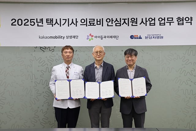 카카오모빌리티에 따르면 지난 29일 경기 성남시 분당차병원에서 상생재단 김수 사무처장, 아이들과미래재단 김병기 본부장, 분당차병원 윤상욱 병원장 등 관계자들이 참석한 가운데 의료비 안심지원 사업추진을 위한 3자간 양해각서(MOU)를 체결했다. 주관사인 상생재단은 사업 추진을 위해 약 22억원 가량의 기금을 조성하고 아이들과미래재단이 사업을 운영한다. 분당차병원은 사업의 홍보와 사례발굴 및 추천을 통한 대상자 모집지원 등 사업 전반에 걸쳐 두 재단업무에 협력한다.