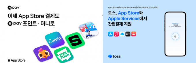 네이버와 토스는 국내 애플 서비스의 간편결제를 제공한다고 16일 밝혔다. 이에 따라 애플 앱스토어와 애플뮤직, 애플TV+, 아이클라우드플러스(iCloud+) 등의 구독서비스에서 게임과 앱, 음악 등의 서비스 결제시 네이버페이와 토스페이를 지불 수단으로 이용할 수 있게 됐다.