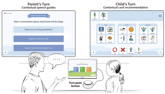 기존의 보완대체 의사소통 도구들은 제한된 카드 소통만을 지원해 아동의 관심사나 미묘한 감정을 충분히 반영하지 못하는 한계가 있었다. 이에 연구팀은 AI 기술을 활용해 아동의 관심사와 상황 맥락을 반영한 개인화된 단어 카드를 실시간 추천하고, 부모에게는 상황에 따른 구체적인 대화 가이드를 제공하는 방식으로 시스템을 설계했다.