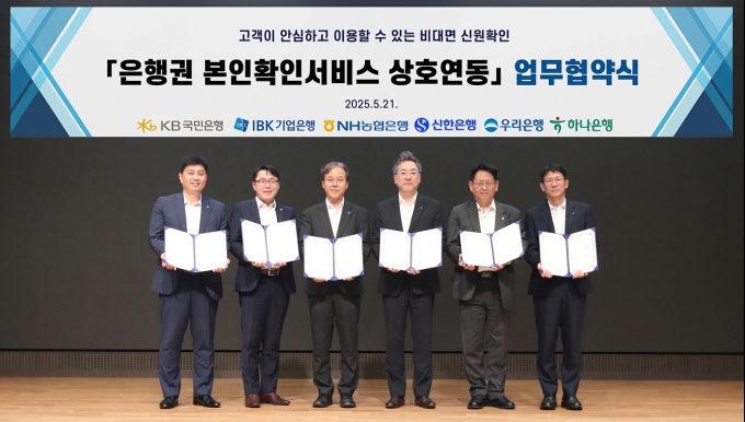 이번 협약을 통해 6개 시중은행은 △은행권 공동 본인확인서비스 개발 △상호 본인확인서비스 연동 △민·관 대상 공동 마케팅 추진 등 고객이 안심하고 이용할 수 있는 비대면 신원확인 서비스 제공을 위해 협력하기로 했다.