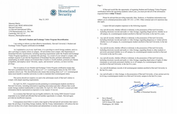 트럼프 정부는 3월부터 하버드 등 시위에 참여한 일부 대학의 유학생들과 경미한 전과가 있는 유학생들의 비자를 취소했다. 이 과정에서 국토안보부는 각 대학에 "유학생 관련 위협 및 위법 행위 정보를 제출하라"고 요구했다. 대부분의 대학은 정부의 요구에 응했지만 하버드는 "학생 보호가 우선"이라며 자료 제출에 응하지 않았다.