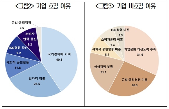 기업에 대해 호감을 가지는 주된 이유를 묻는 질문에 '국가경제에 기여'가 40.8%로 가장 많았고, '일자리 창출'이 26.5%, '사회적 공헌활동'이 11.8% 그리고 'ESG 경영 확산'이 9.2% 순으로 나타났다. 반면 호감이 가지 않는 이유로는 '기업문화 개선노력 부족'이 31.6%로 가장 많았고 '준법·윤리경영미흡'이 26.3%로 그 다음을 차지했다. '상생경영부족'의 비중도 21.1%로 나타났다.