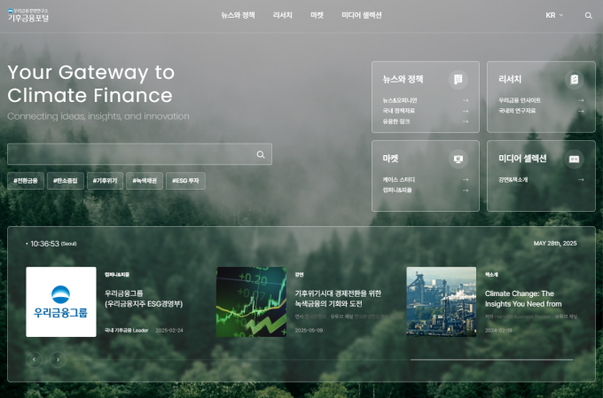이 기후금융포털은 △뉴스와 정책 △리서치 △마켓 △미디어 셀렉션 등 4가지 섹션으로 구성돼, 기후금융 관련 정보를 통합적으로 제공하는 것이 특징이다. 특히 '뉴스와 정책' 섹션에서는 국내외 주요 언론사 및 국제기구에서 발표한 뉴스를 엄선해 매일 업데이트하고, 독자가 핵심내용을 빠르게 파악할 수 있도록 연구소가 직접 작성한 요약본도 제공한다.