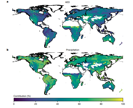 AED 증가는 과거 건조지역뿐 아니라 원래 습한지역까지 가뭄을 심화시켜온 것으로 나타났다. 실제로 최근 5년동안 가뭄이 발생한 면적은 1981~2017년보다 평균 74% 늘었고, 이 가운데 58%는 AED의 증가 때문이었다. 특히 1981~2022년 사이 가뭄 강도는 평균적으로 40% 증가했으며, 서유럽, 동아프리카, 오스트레일리아, 남미 남부 등지에서 그 영향이 두드러졌다.