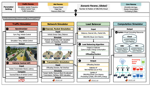 연구팀은 "이 시뮬레이터는 실제 도로 기반 자율주행 시뮬레이터(VTD)와 네트워크·컴퓨팅 시뮬레이터(MATLAB 기반)를 통합한 것"이라며 "차량간 통신품질, 연산처리 능력, 에너지 소비량을 실시간 분석할 수 있다"고 강조했다. 특히 지연시간, 에너지, 안전성을 동시에 고려한 제어가 가능하다는 것이다.