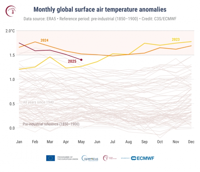 올 5월 평균기온은 산업화 이전과 비교하면 1.4℃ 높게 나왔다. 지난 2023년 6월부터 21개월 연속 월별 지구 평균기온이 산업화 이전보다 1.5℃ 높았던 행보가 2년여만에 멈춘 것이다. 다만 환경전문가들은 기온 상승이 멈춘 것은 아닌 만큼 안심하기 이르다는 의견이 지배적이다.