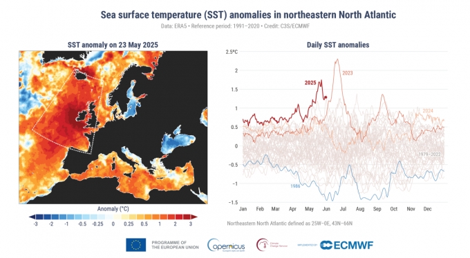 올 5월은 해수면 온도도 20.79℃로 역대 두번째로 뜨거웠다. C3S는 최근 북대서양 북동부에서 해양폭염이 발생하는 등 해양 전반에서 이례적인 고온현상이 지속됐다고 분석했다. 해양폭염이 나타난 지역은 역대 가장 높은 해수면 온도를 기록했다.