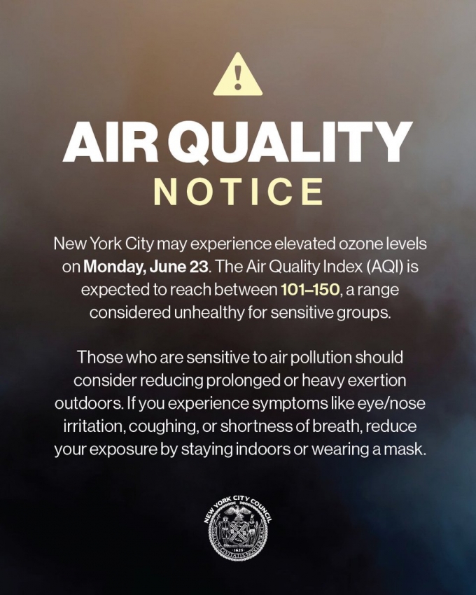 뉴욕주 환경보호국은 23일(현지시간)부터 사흘 연속 오존 대기질 건강 권고를 발령했다. 대기질지수(AQI)는 23일 101, 24일 119, 25일 108로, 3일 연속 경고 수준을 초과했다. 대기질지수 101 이상은 민감군에게 '건강에 해로움' 수준에 해당한다.