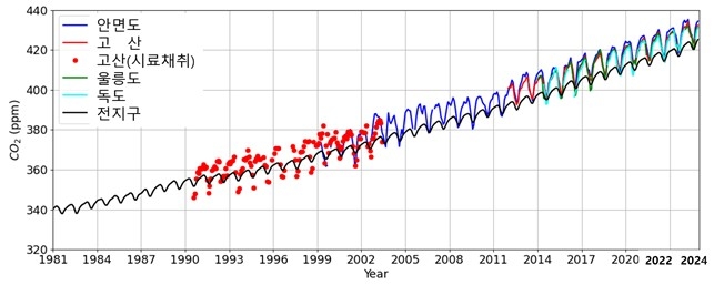 특히 안면도는 2023년보다 3.1ppm 증가해 2016년에 이어 최근 10년(2015∼2024년)간 두 번째로 연간 증가 폭이 컸다. 고산과 울릉도는 각각 전년 대비 2.9ppm, 2.4ppm 증가했다.