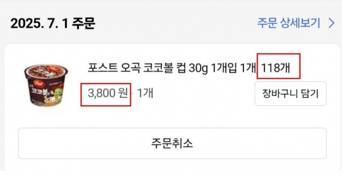 쿠팡 온라인몰에서는 지난달 30일 오후 5시부터 이달 1일 오전 2시까지 '포스트 오곡 코코볼 컵'(30g) 가격이 118개에 3800원으로 잘못 표기돼있었다. 개당 가격이 32원 꼴이었다.